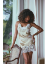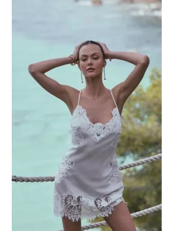 Son décolleté, sublimé par une dentelle fine et délicate, apporte une touche de féminité et de raffinement. Légère et aérienne, cette dentelle crée de subtils jeux de transparence, soulignant avec élégance le caractère intime et sophistiqué de la pièce. Un rappel de dentelle orne également l’ourlet, évoquant le charme intemporel de la lingerie vintage tout en conservant une modernité raffinée.