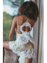 À l’arrière, un somptueux motif de guipure en forme de goutte florale se dessine avec finesse, fusionnant avec le tissu pour un effet visuel à la fois délicat et envoûtant. Relié à la nuisette par de fins biais, ce détail apporte une touche artistique et sublime naturellement les courbes du corps.
