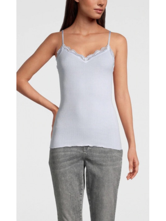 Top Spaghetti en maille côtelée délicate en pur coton mercerisé égyptien avec une dentelle Leavers française élégante et féminine, certifiée et numérotée comme véritable "Dentelle de Calais®".