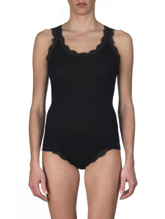 Top spaghetti en maille fine côtelée d'organza de pure soie, orné d'un liseré en satin élégant et raffiné.