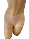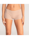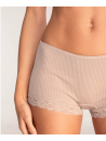 Shorty mi-haut confectionné dans un délicat mélange de ribknit en laine mérinos extra fine et soie pure de haute qualité, ornée d’une élégante dentelle Leavers française, certifiée et numérotée "Dentelle de Calais®", symbole de féminité et de raffinement.